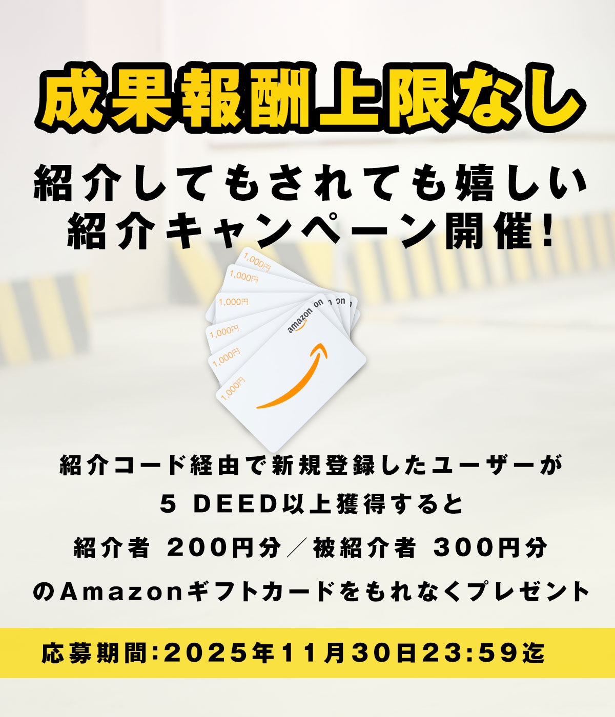 - 紹介される方が期間中に合計 5 DEED 以上を獲得した場合に、紹介する方と紹介される方、双方にAmazonギフトカードをプレゼント!紹介する方=200円分/紹介される方=300円分